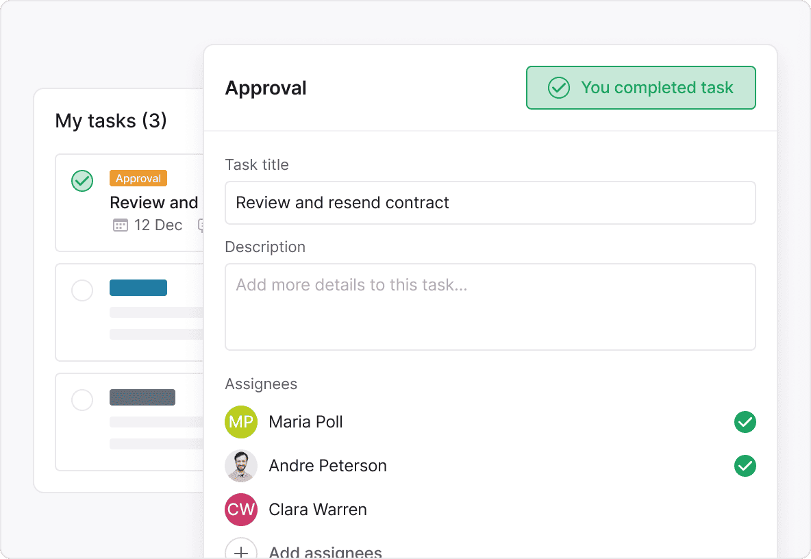 Bei rechtlicher Prüfung oder Freigabe werden Verträge automatisch an die richtigen Personen weitergeleitet – inklusive Kontext und Versionshistorie. Unstrukturierte Kommunikation und endlose Abstimmungsschleifen entfallen. Alle arbeiten im selben System mit gemeinsamer Transparenz und Nachvollziehbarkeit.