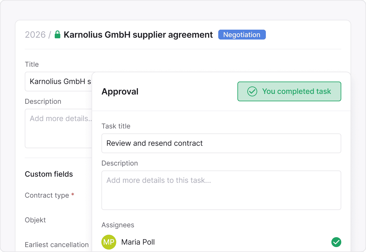 Diese Zentralisierung schafft eine verlässliche „Single Source of Truth“, sodass alle Beteiligten mit denselben Informationen arbeiten. Eine klare Versionskontrolle stellt sicher, dass stets die aktuelle Vertragsversion eindeutig erkennbar ist, während frühere Versionen zur Referenz erhalten bleiben. Einkaufsteams verbringen dadurch weniger Zeit mit der Suche nach Dokumenten und können sich stärker auf das Management von Lieferantenbeziehungen konzentrieren.