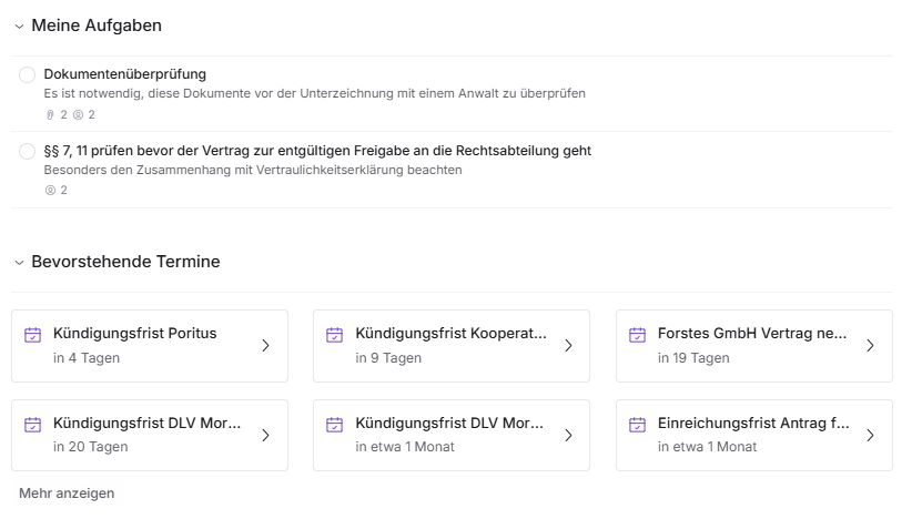 Blockchain-gesicherte Audit-Trails dokumentieren jede Aktion lückenlos. KI-gestützte Risikohinweise machen auf fehlende Unterschriften, abgelaufene Klauseln oder Compliance-Risiken aufmerksam.