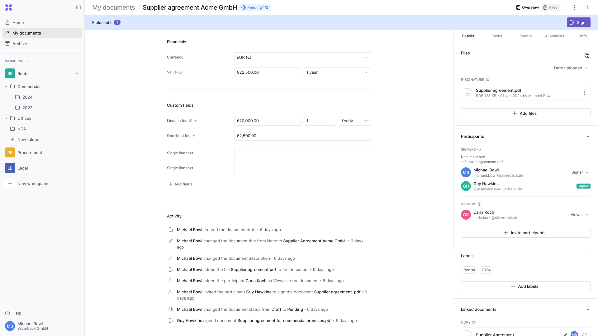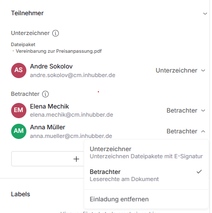 Inhubber unterstützt einfache, fortgeschrittene und qualifizierte elektronische Signaturen (QES). Verträge können innerhalb weniger Minuten rechtsgültig unterzeichnet werden. Anschließend wechseln sie automatisch in die nächste Phase des Vertragslebenszyklus.