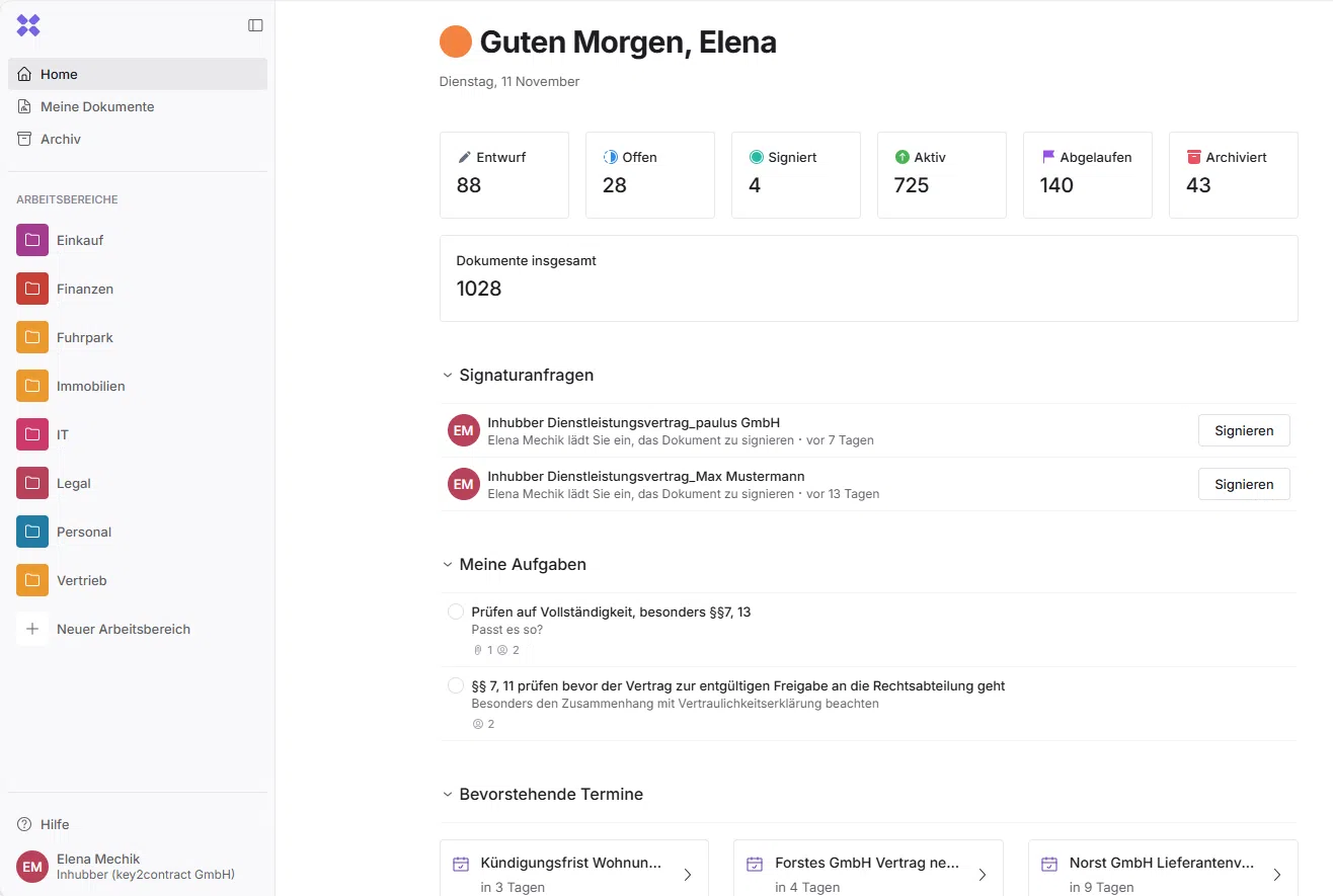 - Transparenz und Verantwortlichkeit: Alle Beteiligten erhalten sofortige Einblicke in Zuständigkeiten, Fristen und Status – das stärkt das Vertrauen in die Rechtsabteilung.