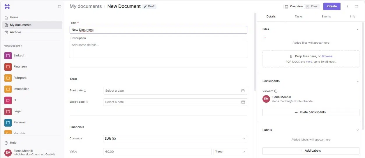 This design ensures flexibility and scalability. Whether you’re working from the office, from home, or on a business trip, all contracts and associated data remain accessible and secure in one place. Inhubber’s servers are hosted in ISO 27001-certified data centers in Germany, ensuring compliance with European privacy standards and providing reliable uptime and performance.