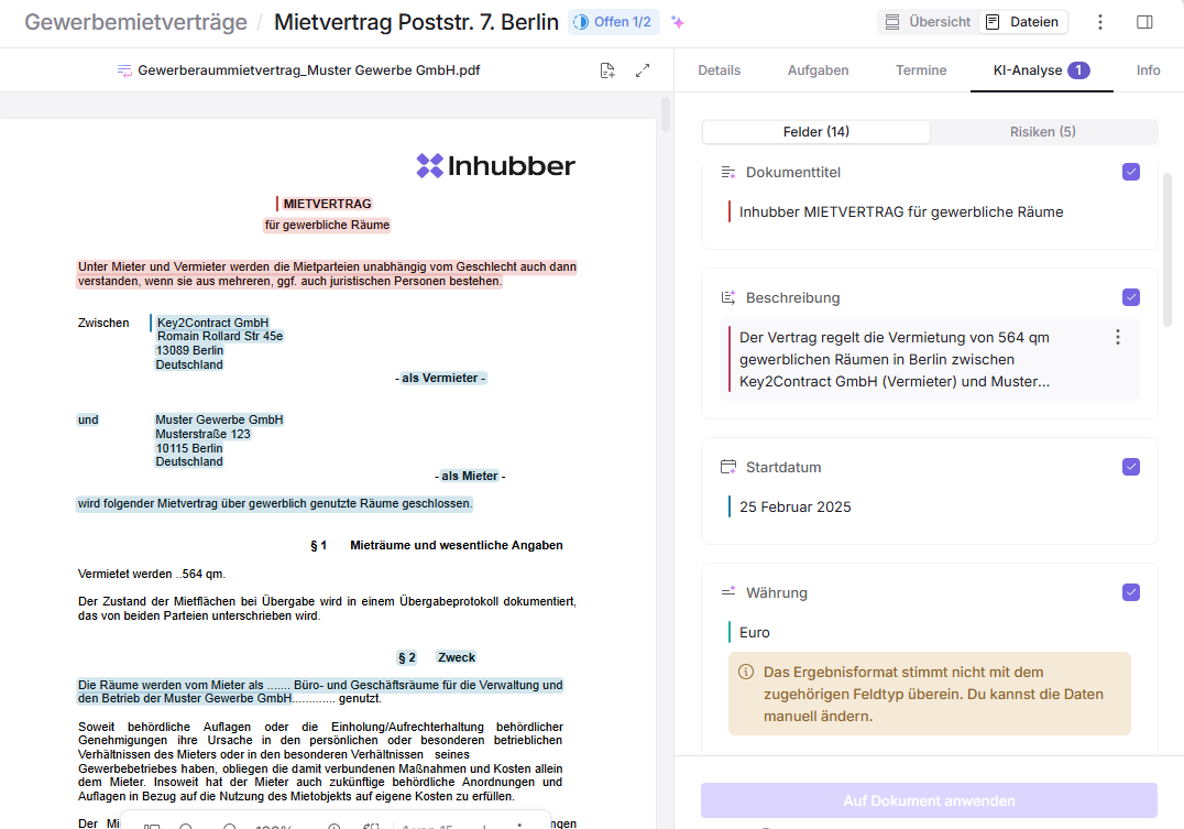 Another key advantage of digital systems is that contracts are no longer stored merely as files, but as structured data sets. Relevant information such as contract terms, termination dates, counterparties, responsibilities, and specific conditions is transferred into defined fields, making it comparable and easy to analyze.